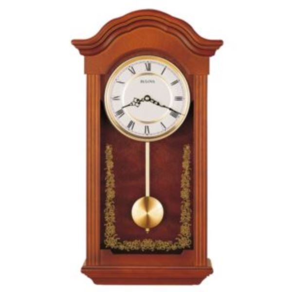 Solid wood case, mahogany finish. Metal Vienna-style dial. Pendulum. Harmonic 2 triple-chime movement plays choice of Westminster, Ave Maria or Bim-Bam melody on the hour. Quarter-hour Westminster chime and strike available. Adjustable volume control. Automatic night shutoff available. Decorative screened glass. Requires (1) AA, (2) C batteries, not included.