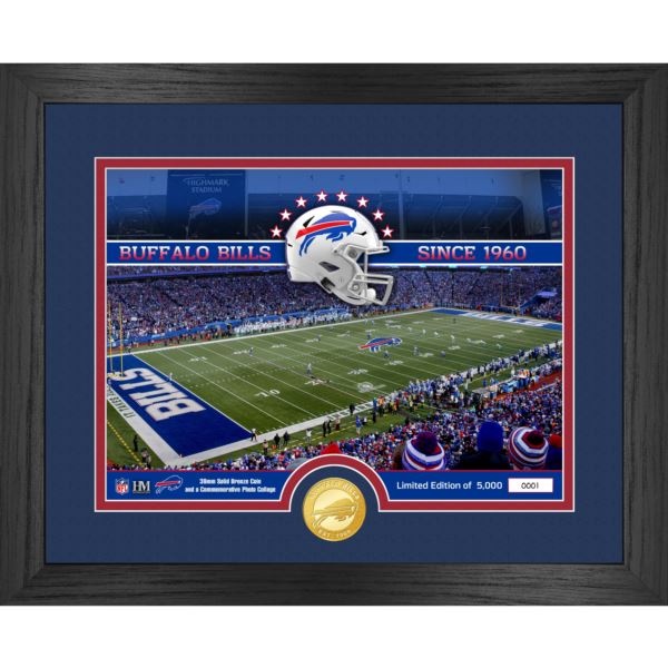 This limited edition 13" x 16" frame features double matting and a hand numbered 8"x10" custom print commemorating your NFL's favorite team home stadium. Below the pictures is a 39mm minted coin of your favorite team. As a limited edition of only 5000 and officially licensed by the NFL, each photo mint is accompanied by a certificate of authenticity and is delivered ready to hang on the wall. (Buffalo Bills;)